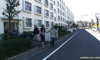 Ugly Asian dark haired Miki Sugimoto blows cock and fucks doggy style outside